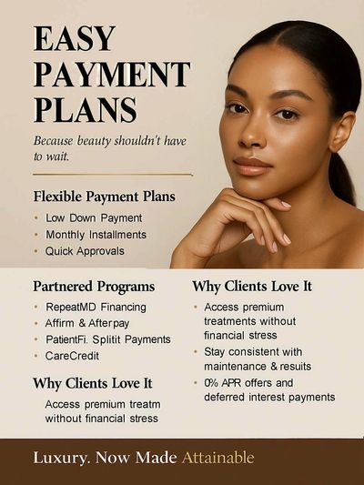 We understand that cosmetic procedures and invsting your well-being is not covered by insurance. This can be a significant investment. That's why we offer a range of financing options to help make your treatment more affordable. We offer 0% financing, No Credit Check options with credit card installments, accept Afterpay and Affirm Checkout! Contact us to learn more.